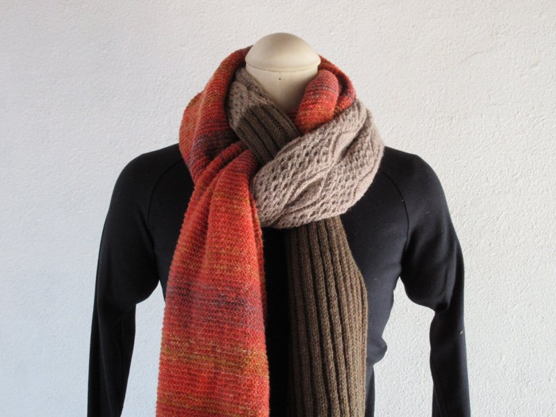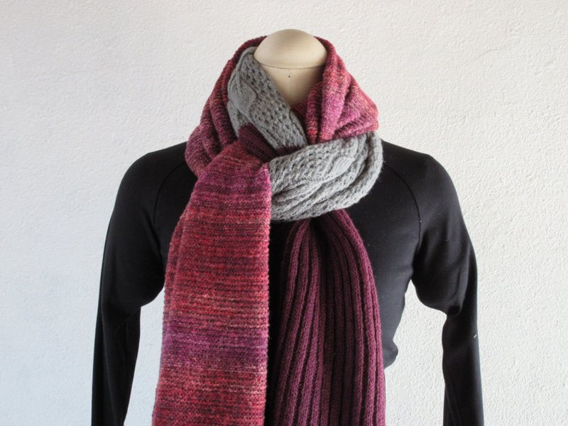 色合わせ、異なる柄が、印象的な大判ストールです。