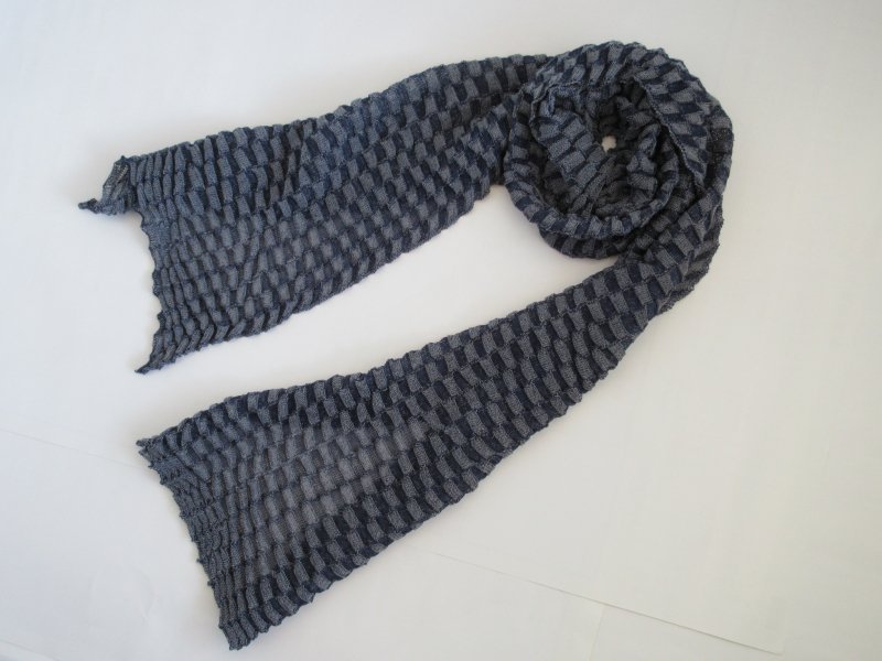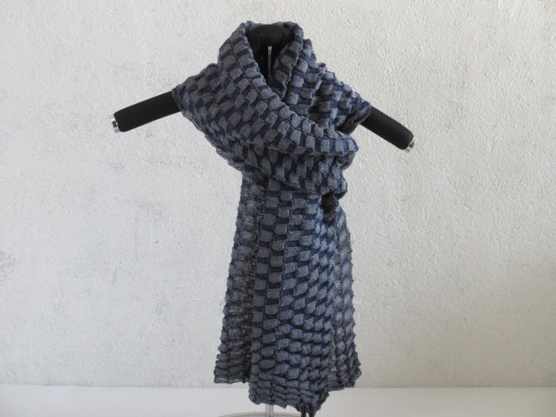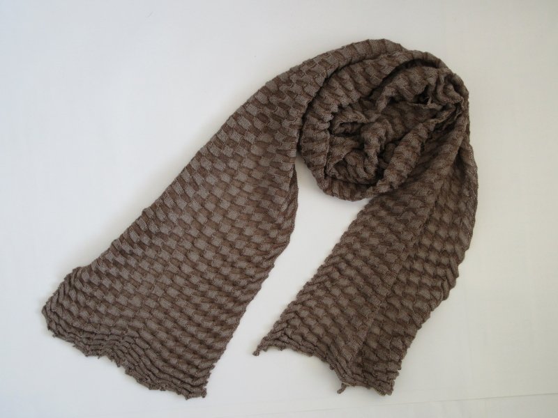 シルク本来の持つ神秘性、魅力をナチュラルな手法で表現する為、生糸(繭から引き出した繭糸で加熱精練していないもの)と精練糸を使用して編みのみで凹凸感をだし後加工は、一切行わずに作ったマフラーです。